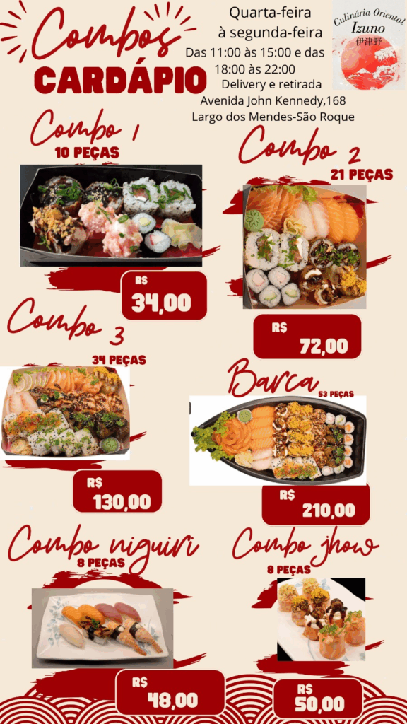 Agora você pode saborear o melhor da comida oriental na Praça Largo dos Mendes, Av. John Kennedy, 168. Pratos frescos, preparados com ingredientes selecionados e o toque especial da Izuno que faz toda a diferença.