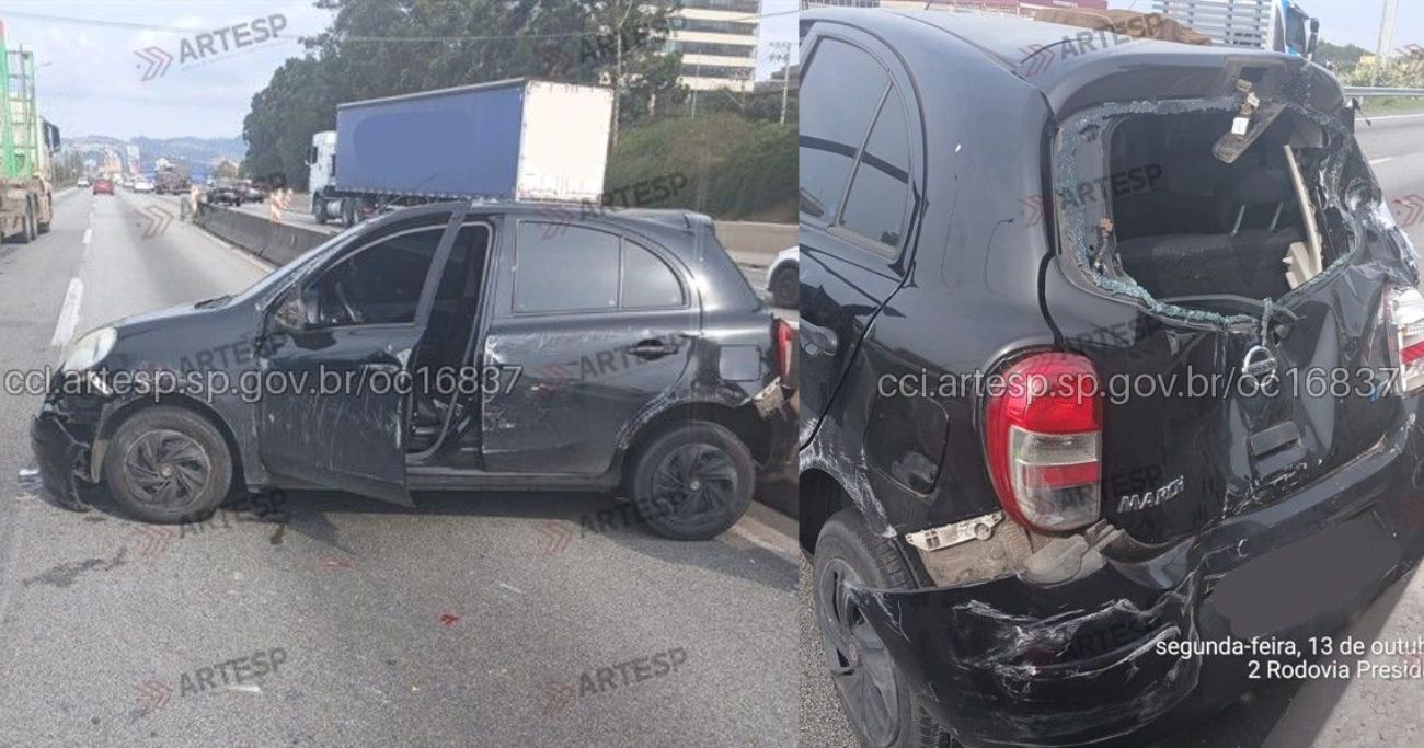 De acordo com informações da concessionária que administra a via, o acidente ocorreu por volta das 8h20, quando uma carreta que trafegava pela faixa 3 tentou mudar para a faixa 2 e colidiu lateralmente com um Nissan March. Com o impacto, o automóvel perdeu o controle, rodou na pista e acabou colidindo contra a barreira de concreto que separa as faixas.