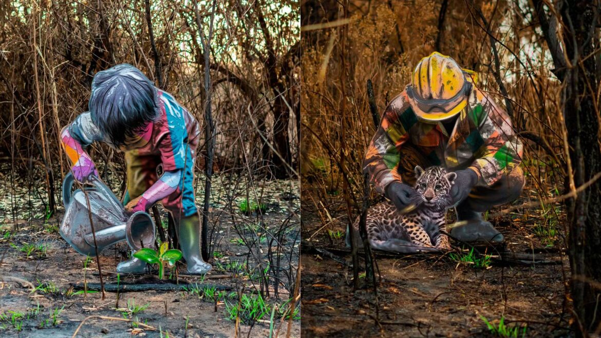 Kobra faz intervenção artística em área de mata devastada por queimadas no interior de SP: ‘Repensar nossa responsabilidade’