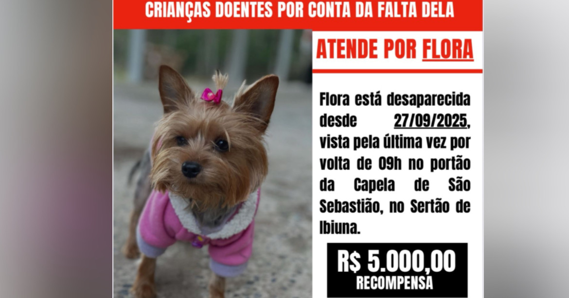A cadela Flora está desaparecida desde a manhã de sábado, 27 de setembro, quando foi vista pela última vez por volta das 9h, próximo ao portão da Capela de São Sebastião, no bairro Sertão, em Ibiúna.