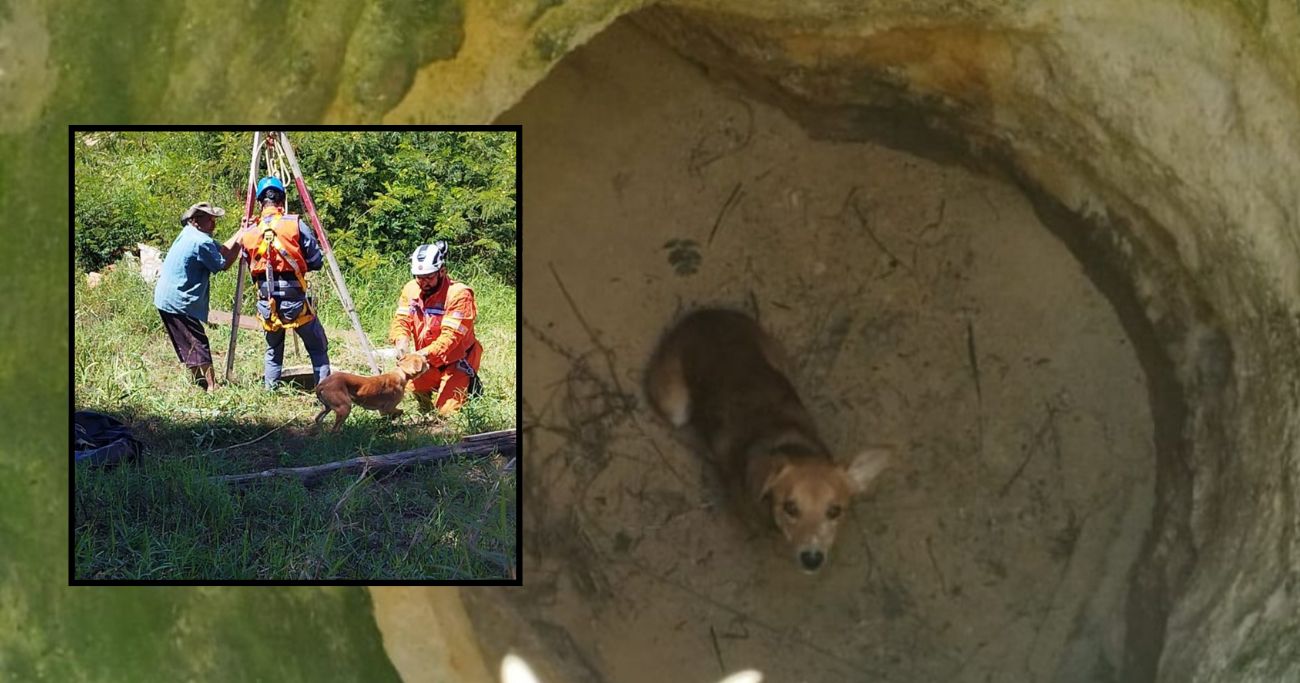 Um cachorro de cor caramelo foi resgatado de um poço com cerca de cinco metros de profundidade na manhã desta terça-feira, no município de Mairinque.