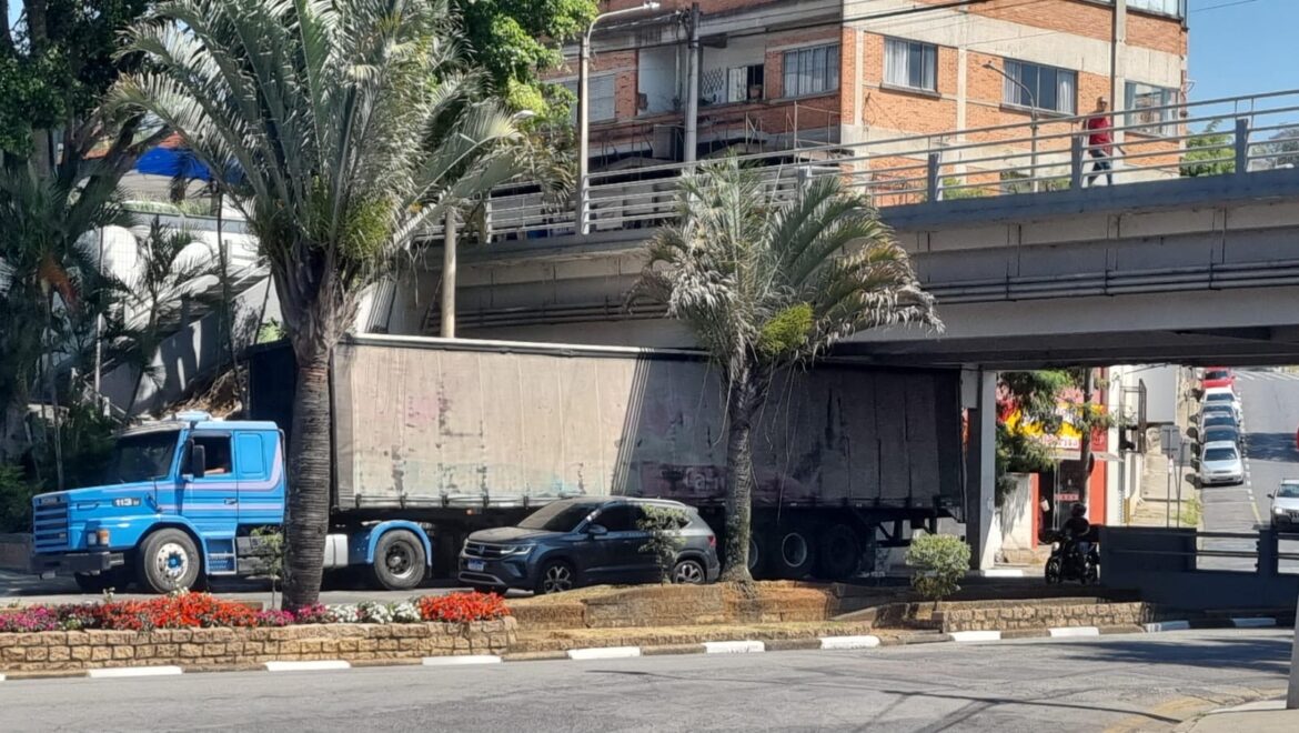 Um carreta de carroceria baú, ficou entalada ao passar por baixo do viaduto Abel de Almeida Filho, na Avenida Antonino Dias Bastos (Marginal) próximo a região do Supermercado São Roque, em São Roque na manhã desta segunda-feira, 15.