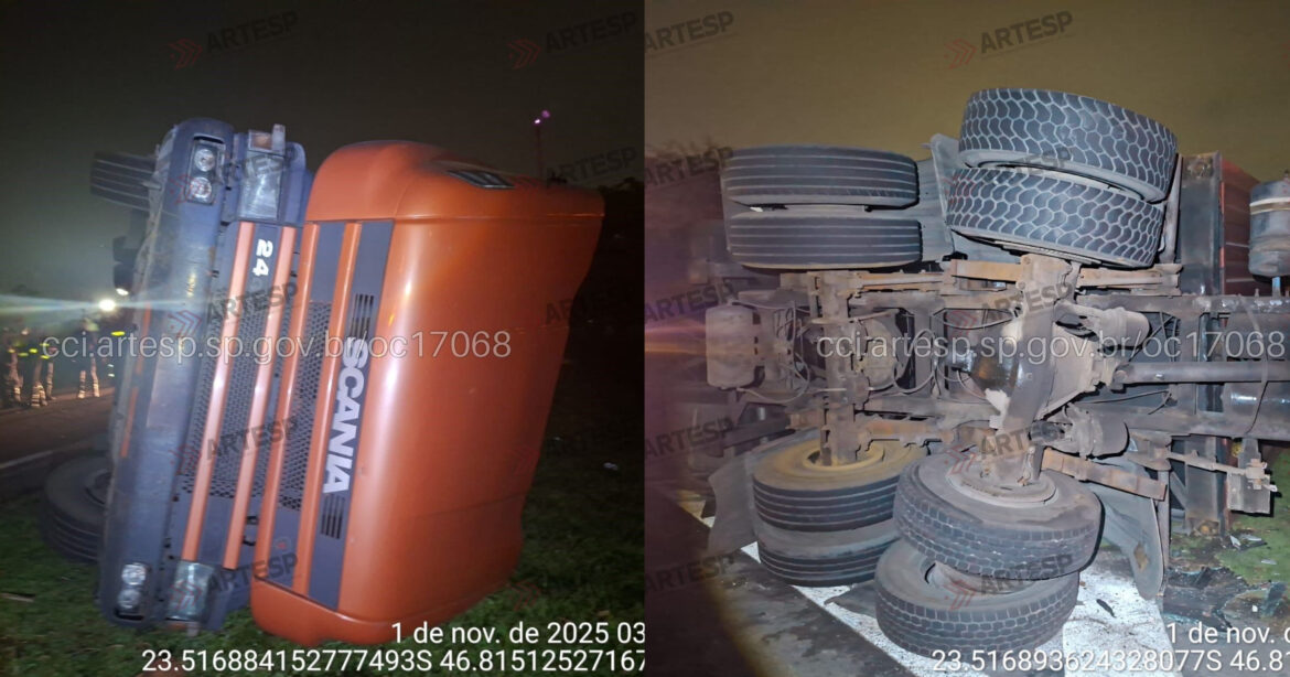 Um tombamento de carreta interditou totalmente uma alça do Rodoanel Mário Covas (SP-021), no sentido interno, entre os municípios de Carapicuíba e Osasco, na madrugada deste sábado (1º).