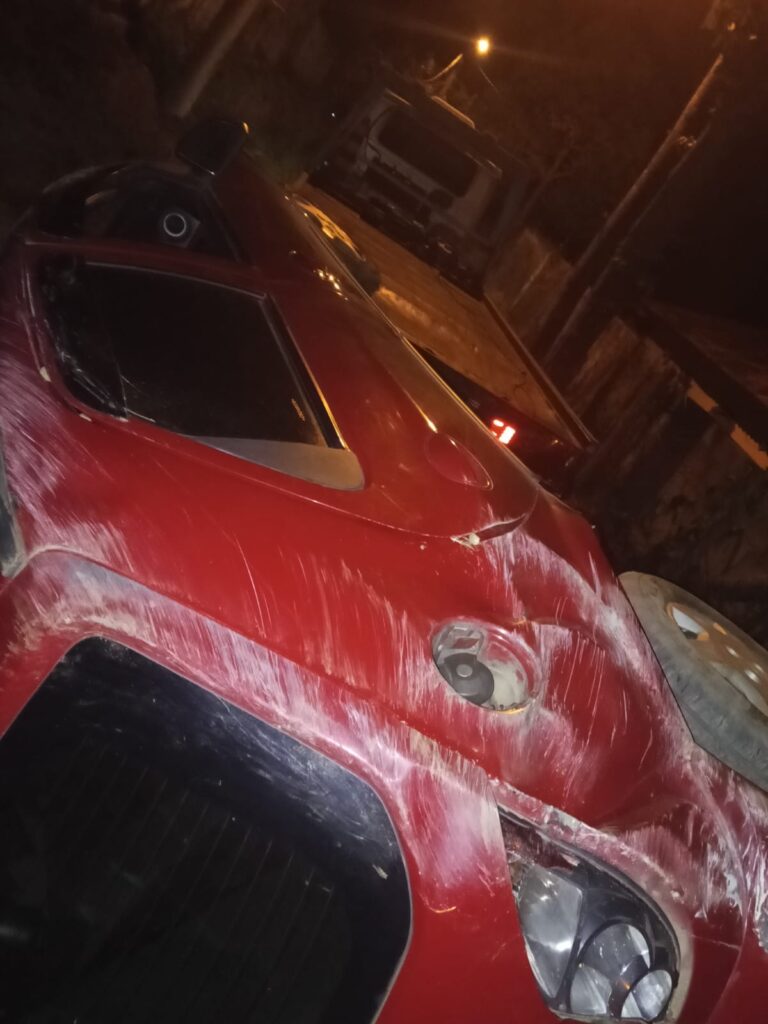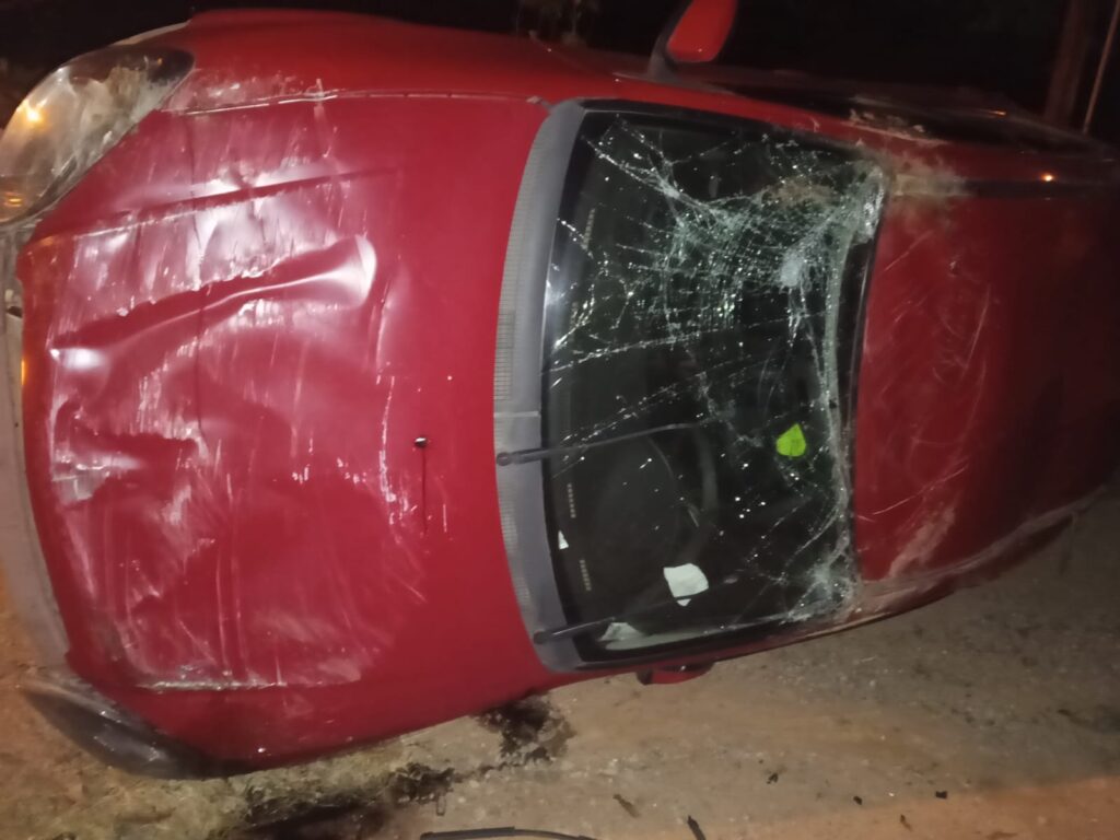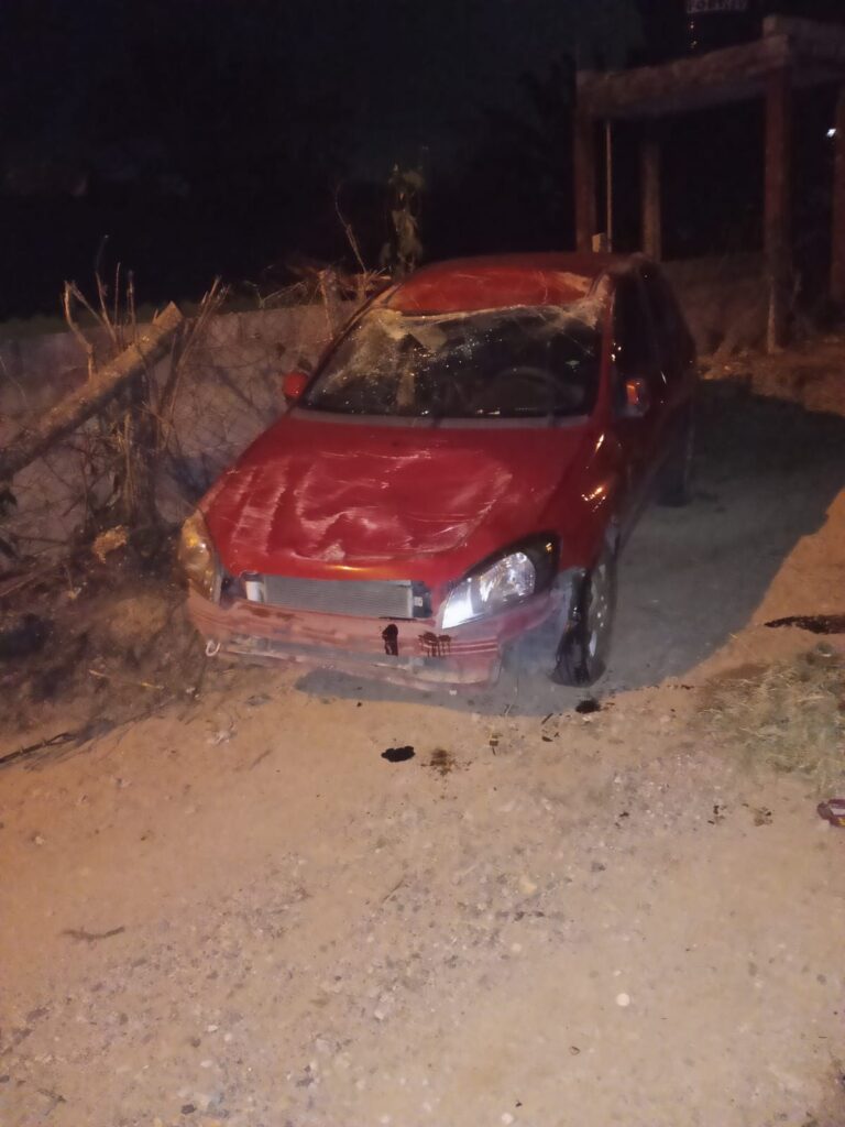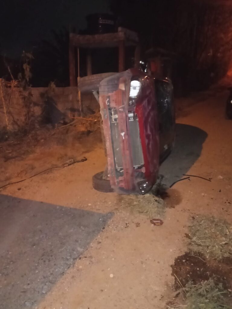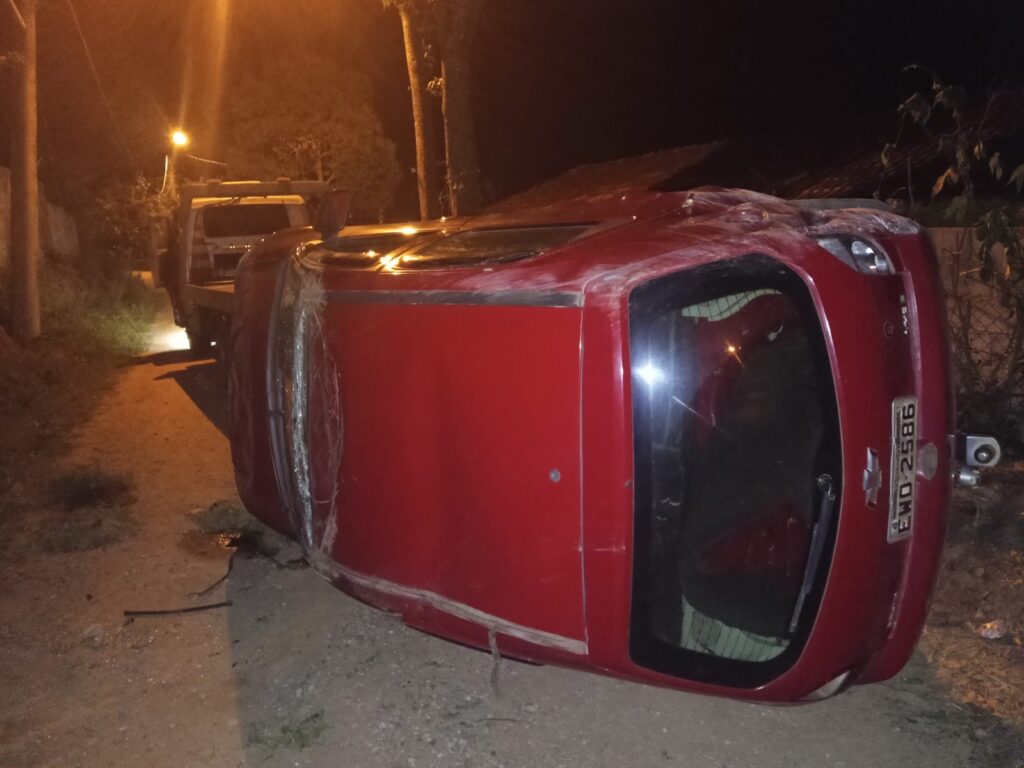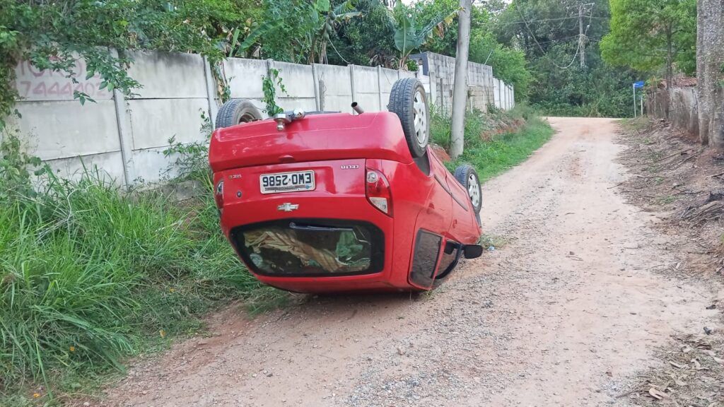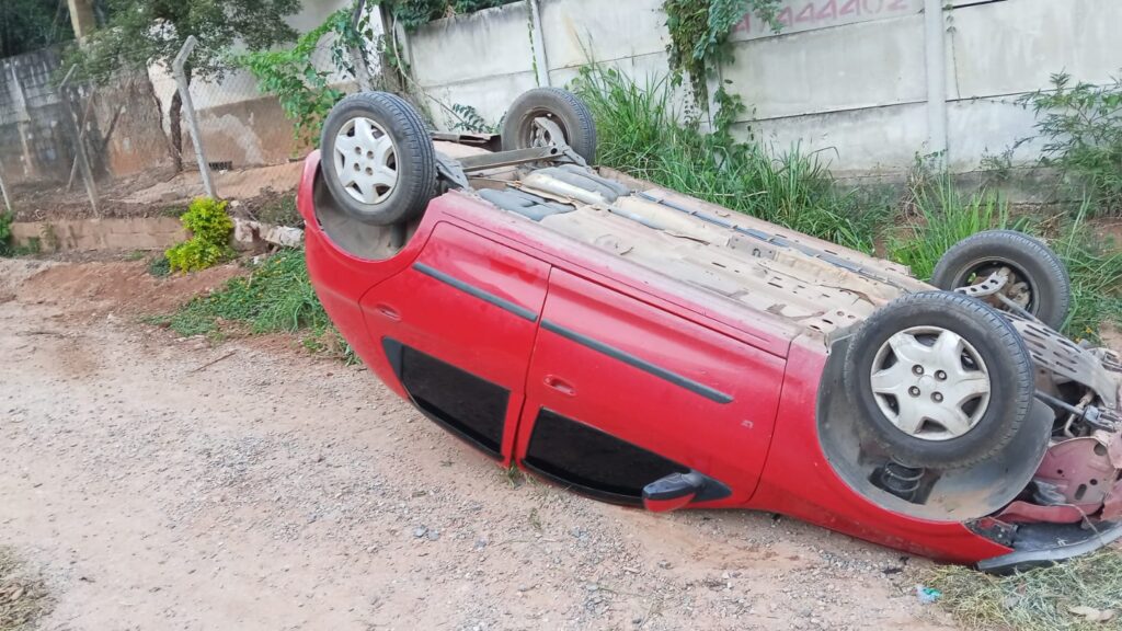 Um carro Celta vermelho capotou na descida da Rua das Primavera, no bairro Mombaça, em São Roque, na última quarta-feira (15). O veículo ficou completamente destruído e o motorista não sofreu ferimentos graves.