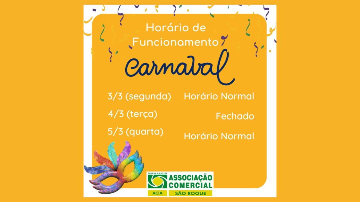 A Associação Comercial de São Roque (ACIA) divulgou o horário de funcionamento do comércio local durante o período de Carnaval. Segundo a entidade, na segunda-feira (3 de março), as atividades ocorrerão normalmente.