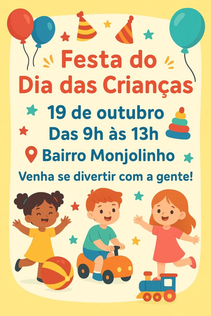 No próximo sábado, 19 de outubro, a comunidade do bairro Monjolinho, em Mairinque (SP), realiza a Festa do Dia das Crianças, um evento gratuito e aberto a toda a população. A celebração acontece das 9h às 13h, na Rua 26, e promete uma manhã repleta de alegria, brincadeiras e sabores.