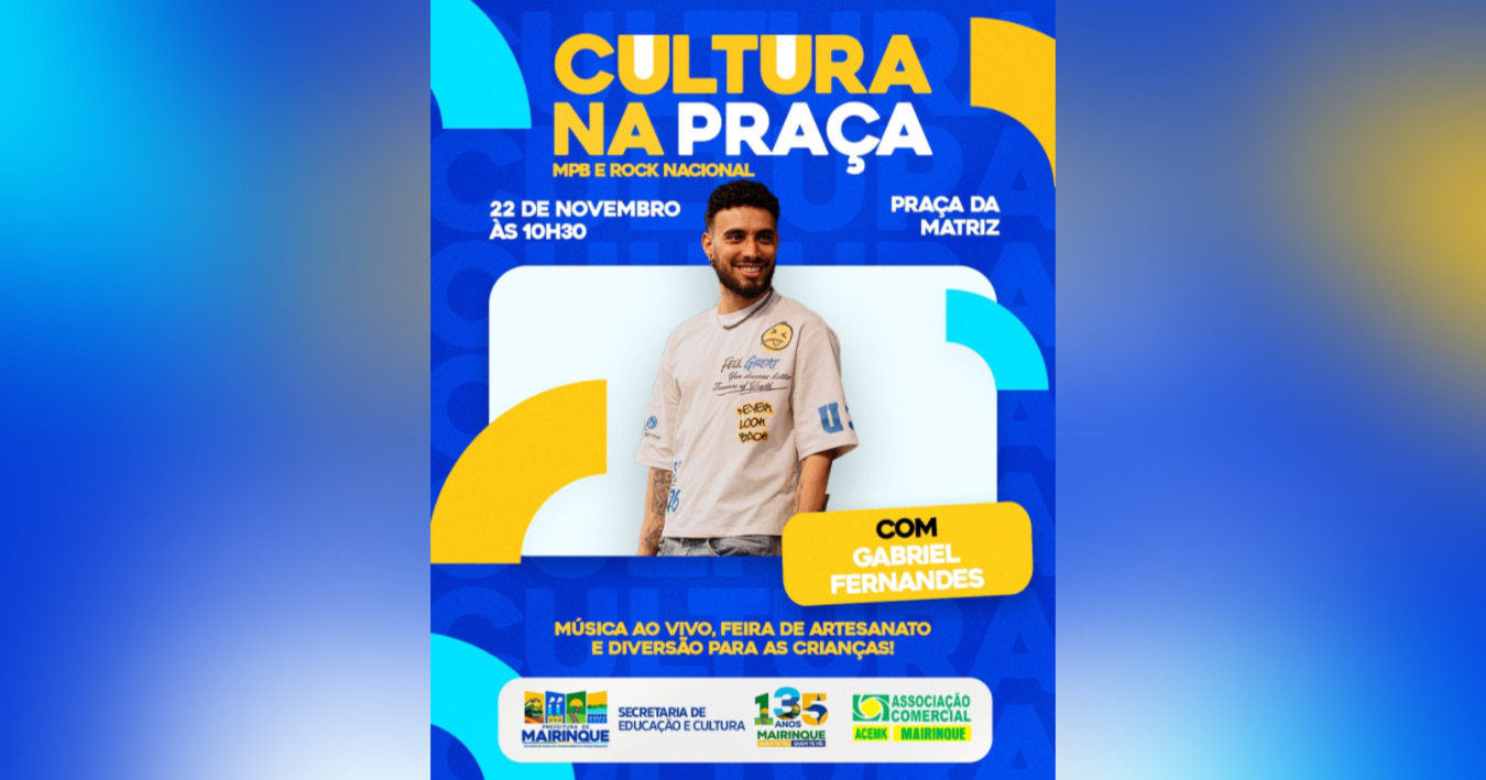 O Cultura na Praça deste fim de semana terá apresentação do músico Gabriel Fernandes, que levará ao público um repertório de MPB e rock nacional durante a manhã. A atração integra a programação realizada na Praça da Matriz, no Centro, reunindo moradores e visitantes para mais uma edição do evento cultural de Mairinque.