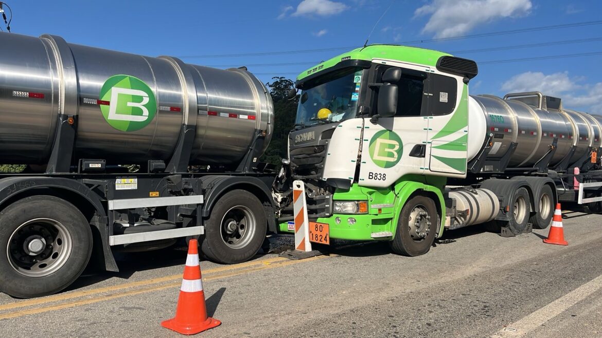 O motorista informou que tentou evitar a colisão com um motociclista que trafegava próximo, desviando e acabando por atingir a outra carreta. Não houve feridos.