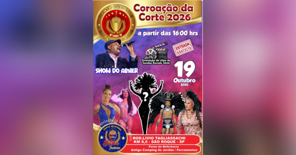 A Escola de Samba Santa Quitéria realiza no domingo (19), a Coroação da Corte 2026. A festa começa a partir das 16h, com entrada gratuita.