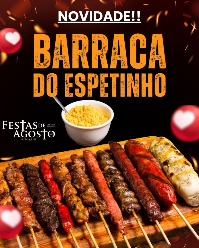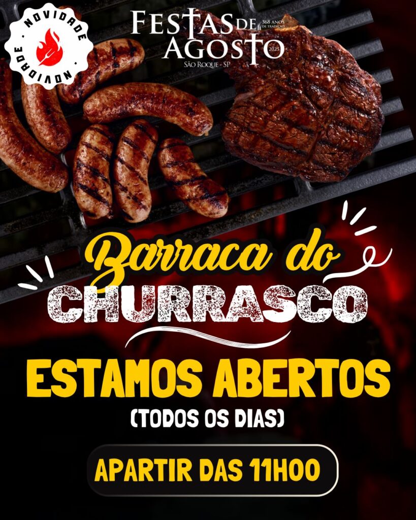 A estrutura reúne opções de churrasco na brasa, espetinhos e porções diversas. A barraca integra a programação tradicional da festa promovida pela paróquia da Igreja Matriz.