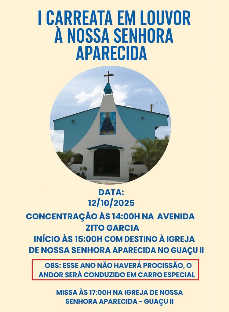 No dia 12 de outubro, acontecerá a 1ª Carreata em Louvor a Nossa Senhora Aparecida. A concentração será às 14h Avenida Zito Garcia, com saída prevista para às 15h, em direção à Capela de Nossa Senhora Aparecida, localizada no bairro Guaçu II.