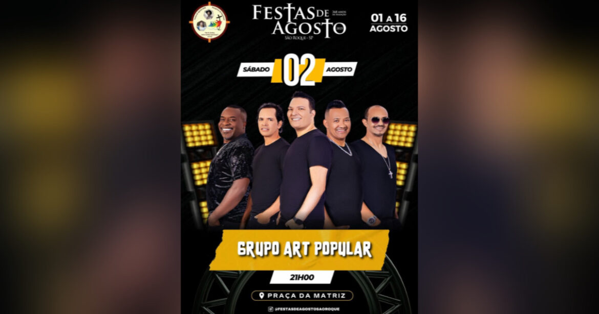 Acontece neste sábado (2) o segundo dia de shows das Festas de Agosto 2025 em São Roque. A principal atração da noite será o grupo Art Popular, que sobe ao palco às 21h na Praça da Matriz.