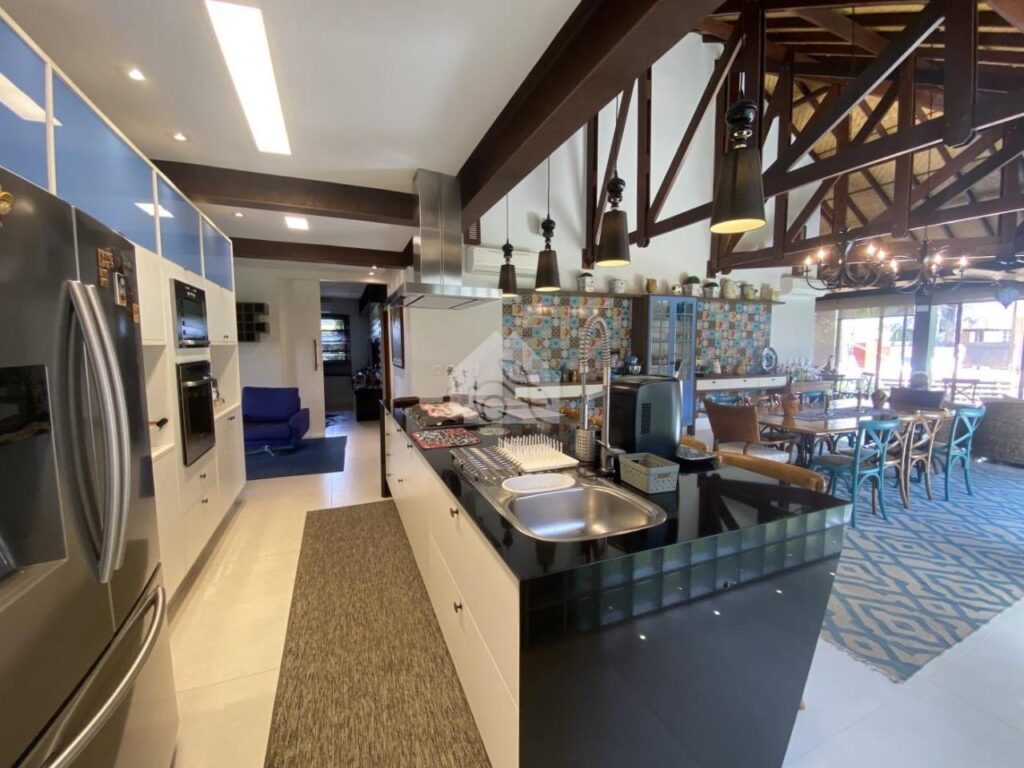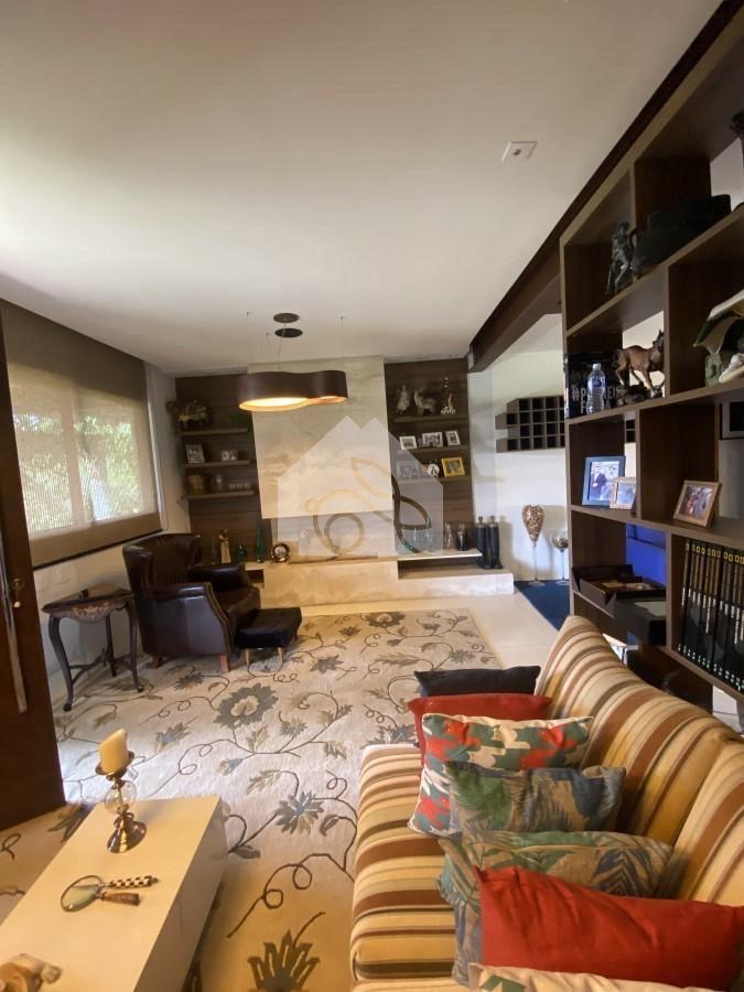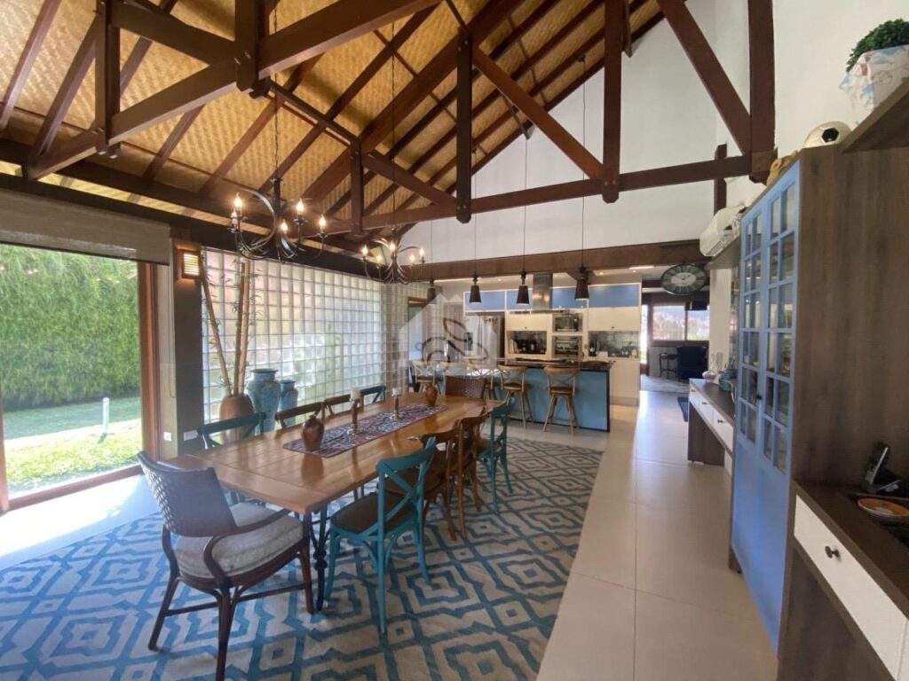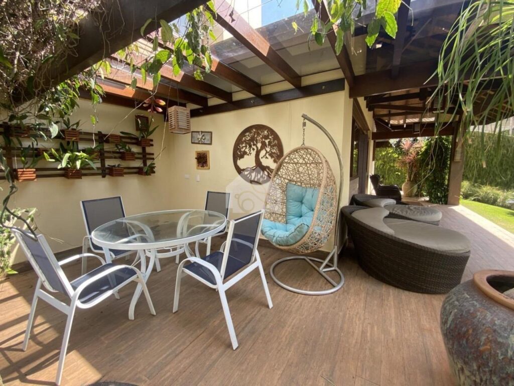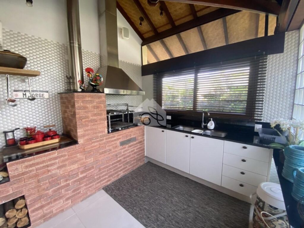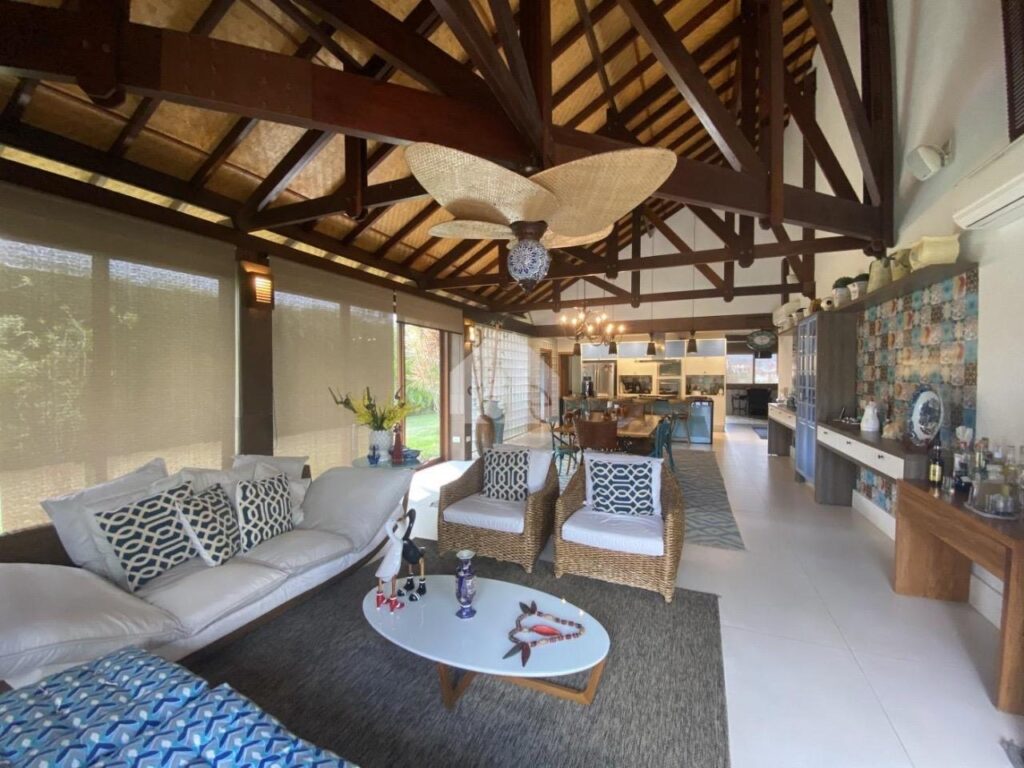 Com área total de 1.000 m² e 350 m² de construção, a casa possui cinco quartos (sendo duas suítes), três salas, seis banheiros e quatro vagas de garagem. O imóvel está mobiliado e conta com acabamento de alto nível, além de lareira e área gourmet.