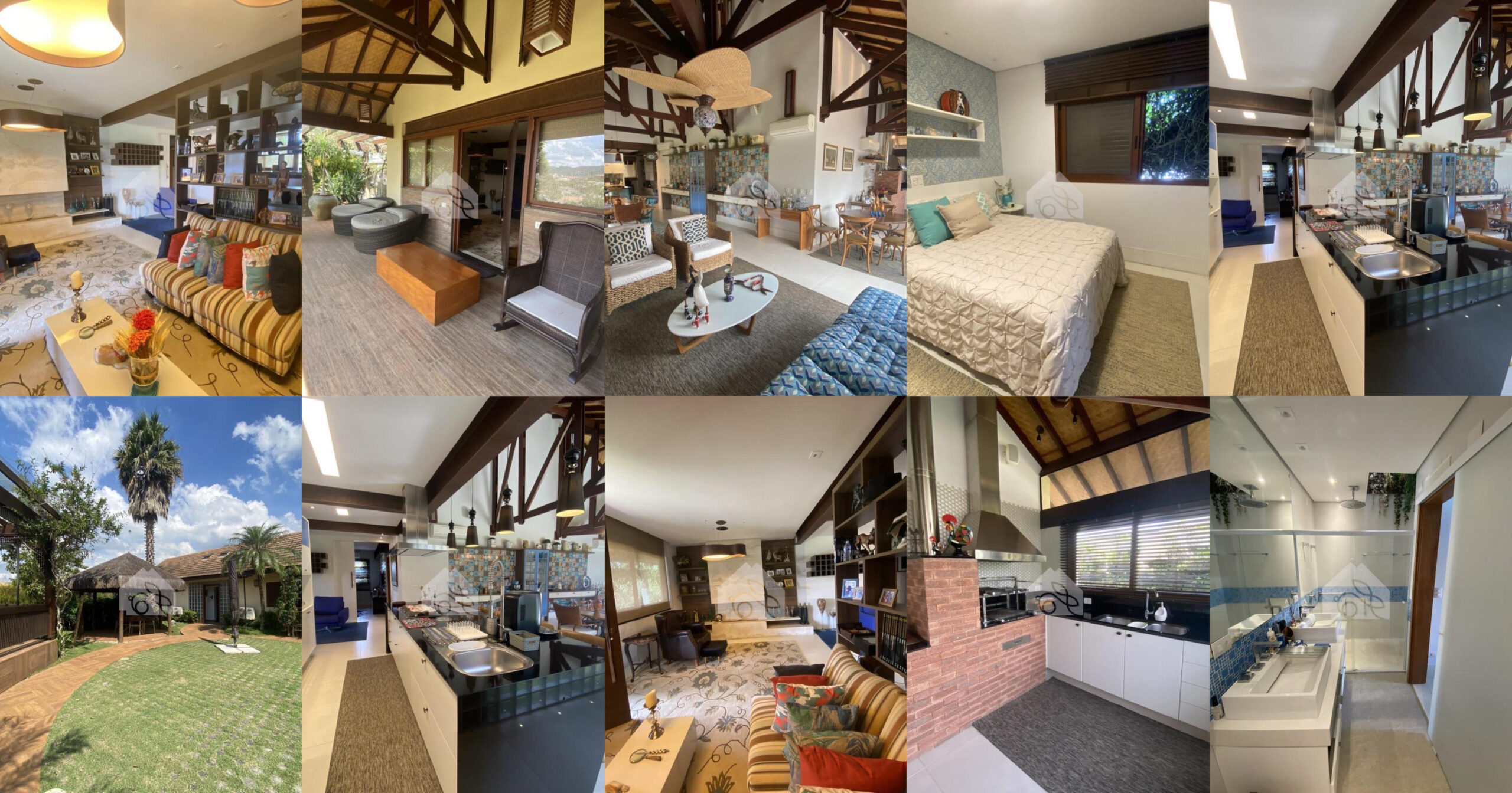 Com área total de 1.000 m² e 350 m² de construção, a casa possui cinco quartos (sendo duas suítes), três salas, seis banheiros e quatro vagas de garagem. O imóvel está mobiliado e conta com acabamento de alto nível, além de lareira e área gourmet.