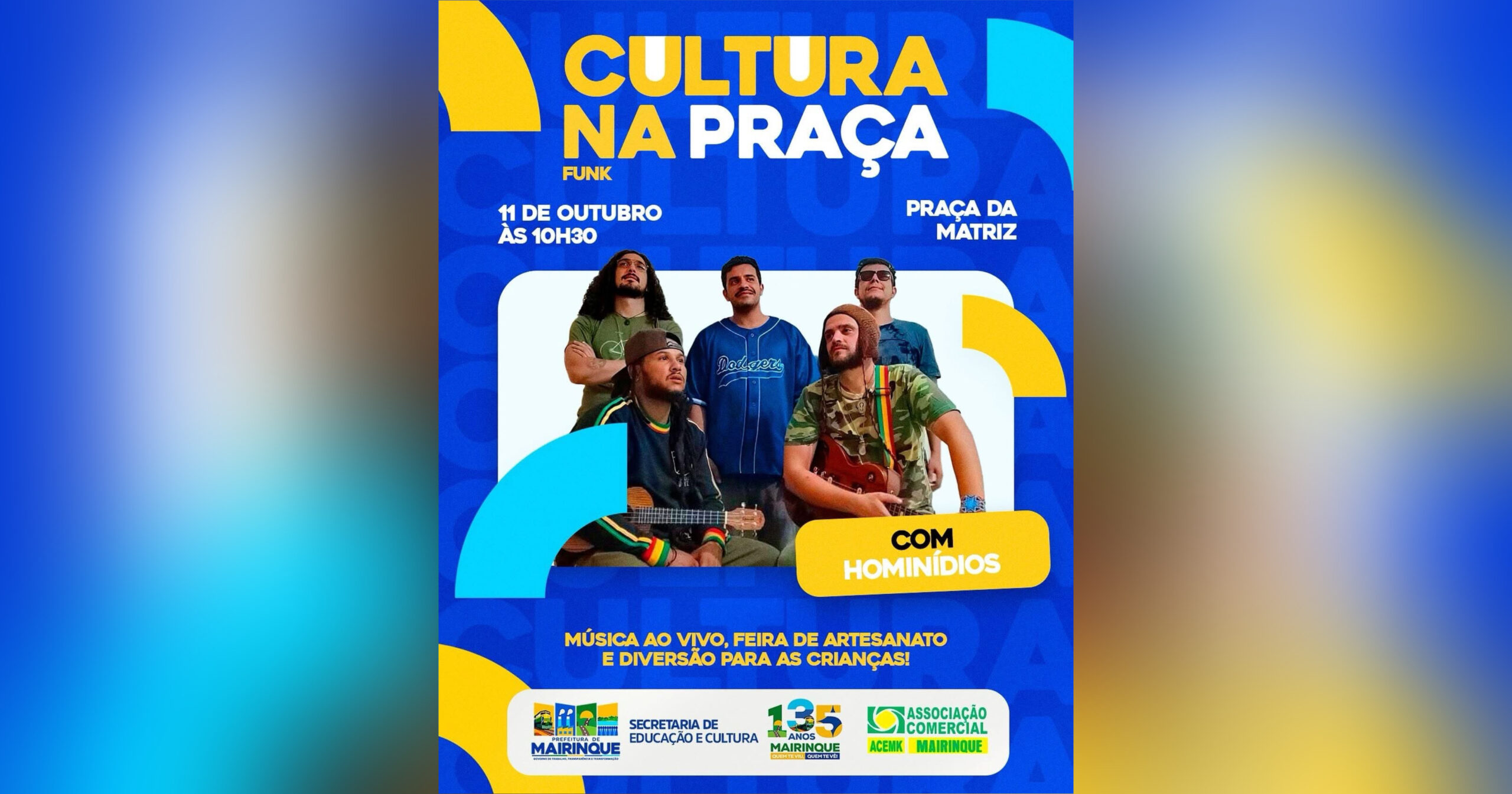O evento Cultura na Praça será realizado neste sábado (11), a partir das 10h30, na Praça da Matriz, em Mairinque. A programação inclui show da banda Hominídeos, que promete animar o público com muito reggae e boas vibrações.