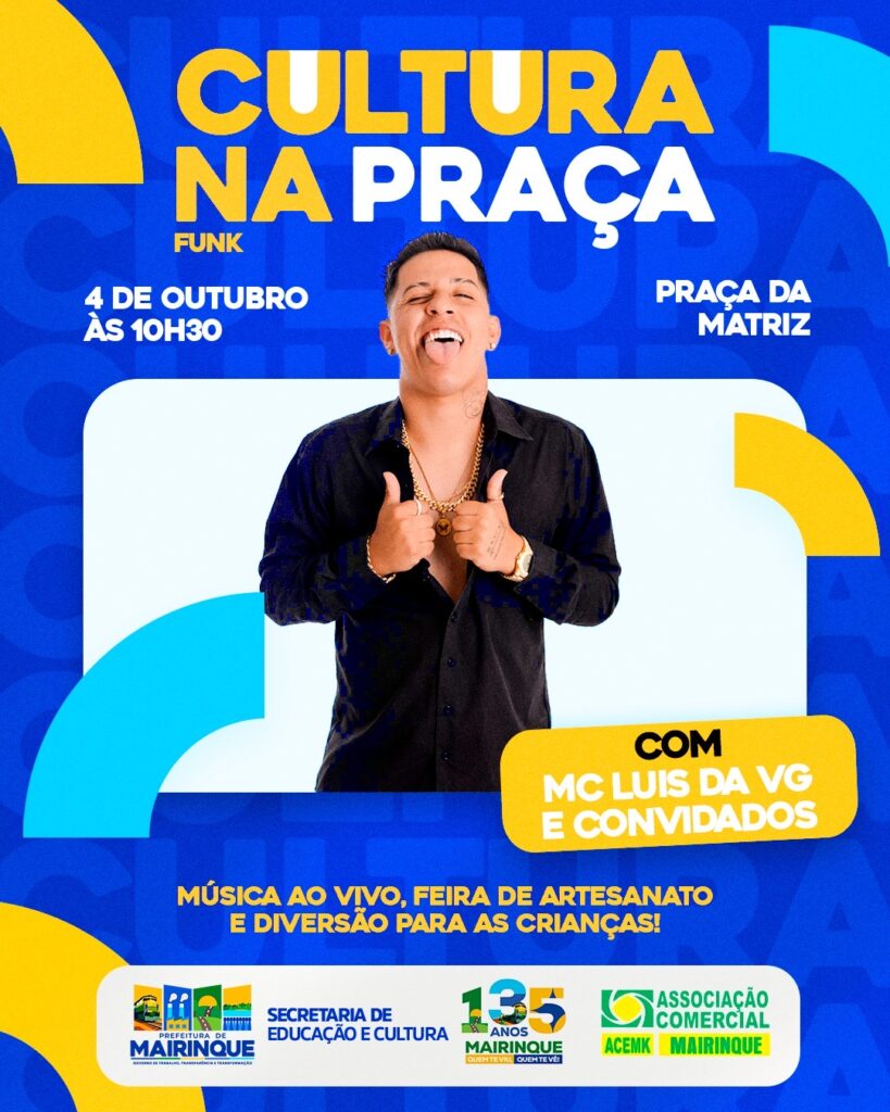 O evento contará com a apresentação do MC Luis da VG e convidados, trazendo muito ritmo e animação para o público. Além do show, a programação inclui feira de artesanato com artistas locais e diversas atividades especiais para as crianças, garantindo lazer e diversão para toda a família.