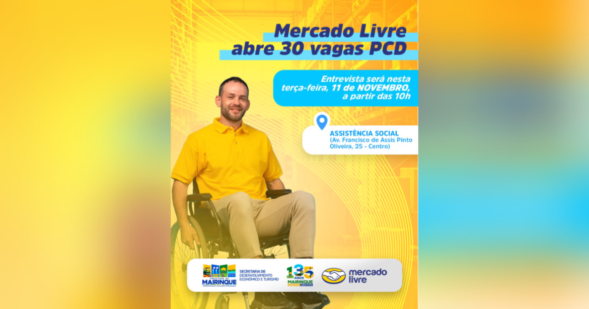 O Mercado Livre em parceria com a Prefeitura de Mairinque, por meio da Secretaria de Desenvolvimento Econômico e Turismo, informa que estão abertas 30 vagas de emprego destinadas a pessoas com deficiência (PCD) para o cargo de Representante de Envios I.