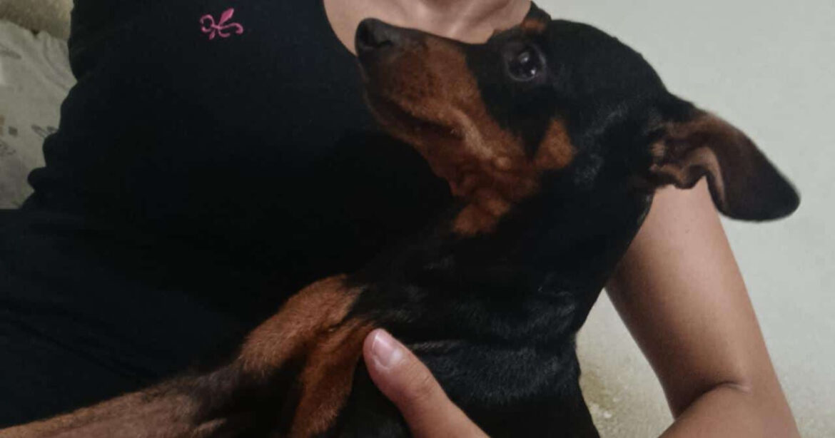 O cachorro pode é da raça Pinscher, e pode ser identificado pelo porte pequeno e pelagem escura.