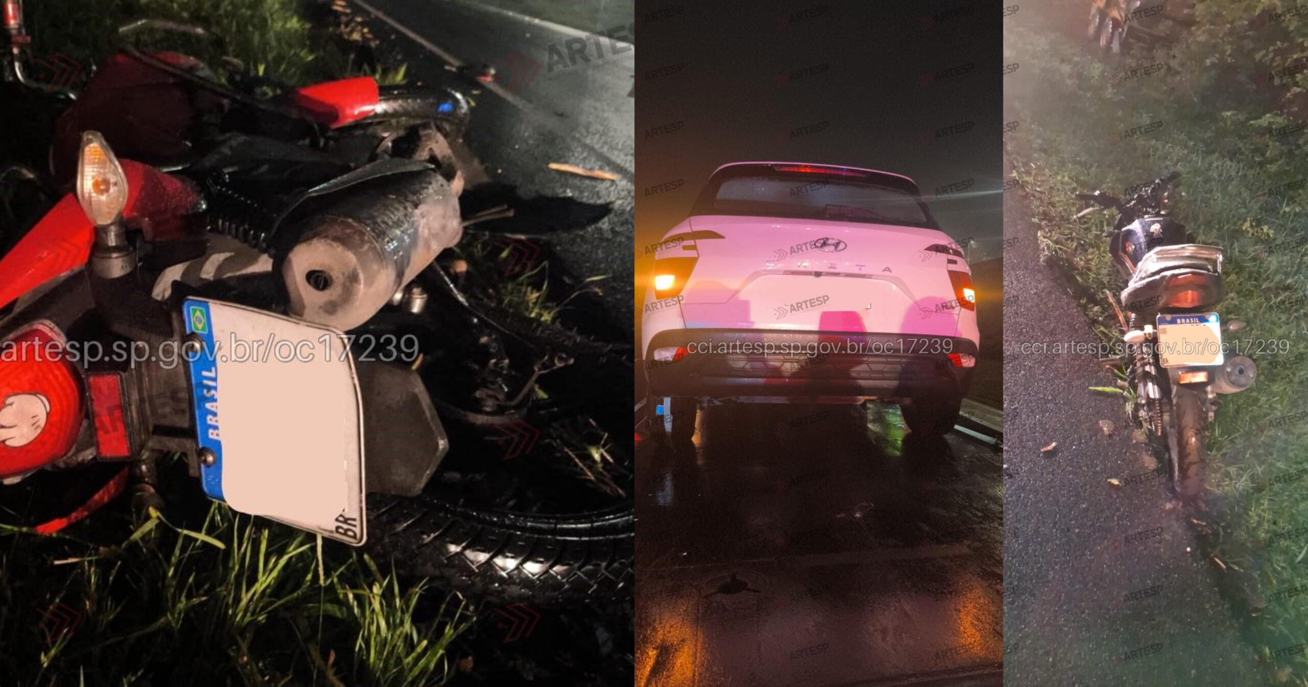 Após a colisão, a motocicleta tombou e caiu sobre a faixa 1. Uma segunda moto, uma Yamaha, não conseguiu frear ou desviar e bateu na primeira, também sofrendo tombamento. Em seguida, um Hyundai Creta, que trafegava no mesmo sentido, chocou-se com as duas motocicletas caídas na pista.