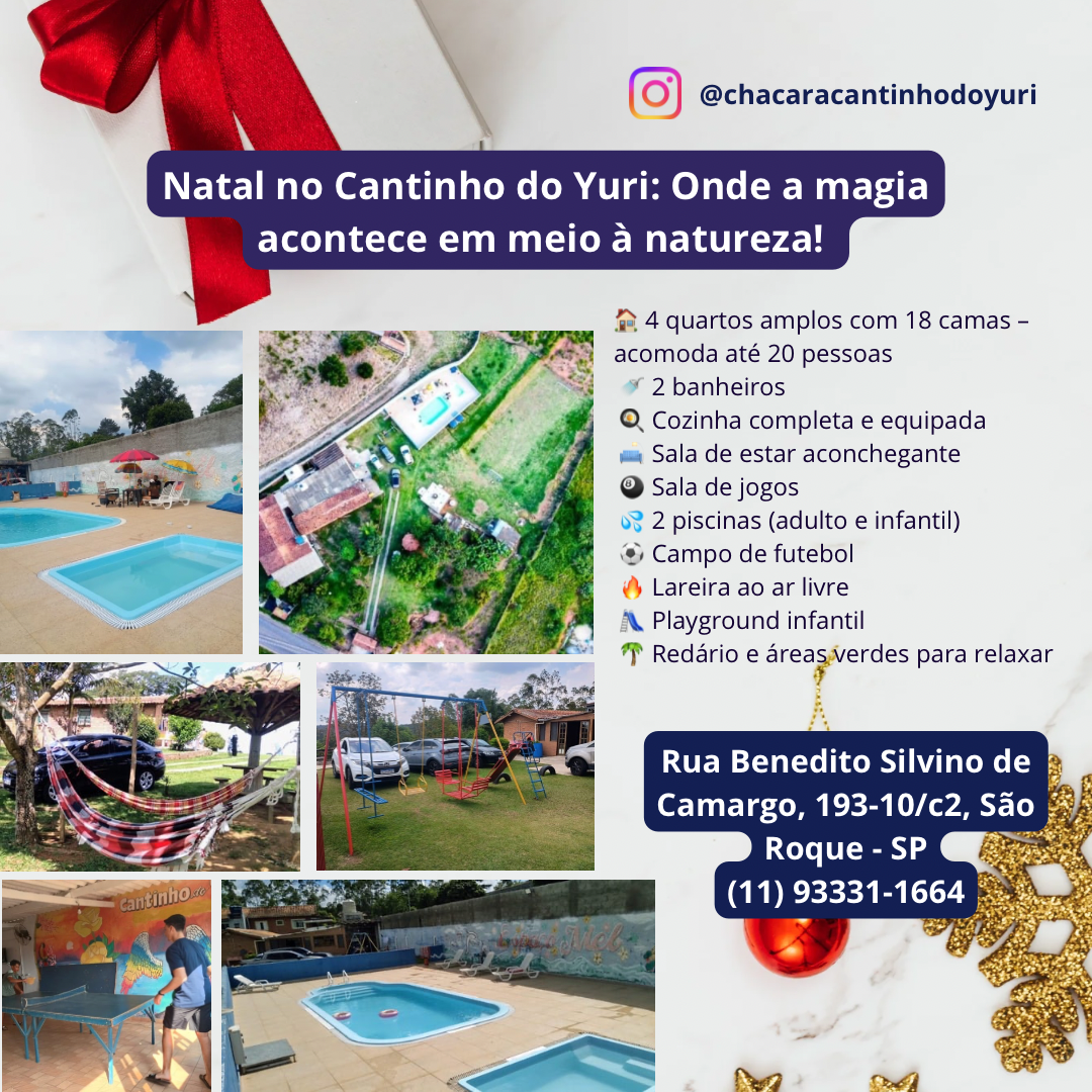 Já pensou em celebrar o Natal cercado por verde, conforto e momentos especiais ao lado de quem você ama? O Cantinho do Yuri é o refúgio perfeito para reunir família e amigos e viver dias de pura tranquilidade e alegria.
