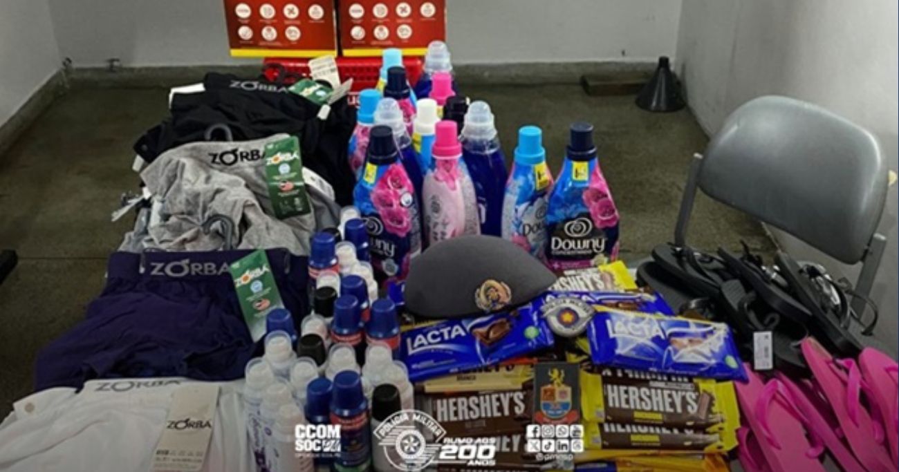 Entre os produtos recuperados estavam: três liquidificadores, 85 chocolates, sete pares de chinelos, 21 desodorantes, 65 peças de roupa íntima e 13 unidades de amaciante.