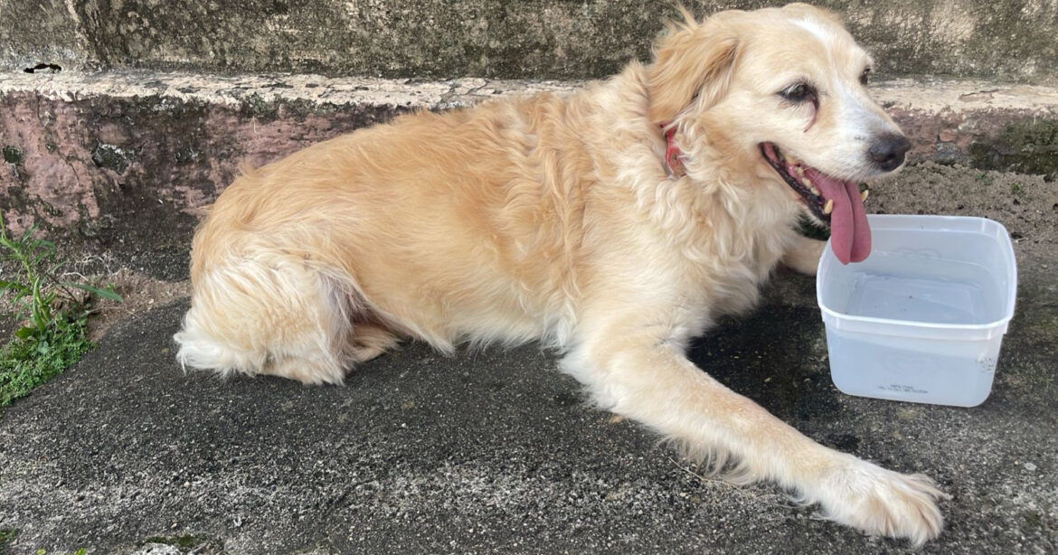 Segundo ela, a cachorra está bem cuidada, é dócil e usa coleira. A cachorra pode ser identificada pelo porte grande e pelagem clara.