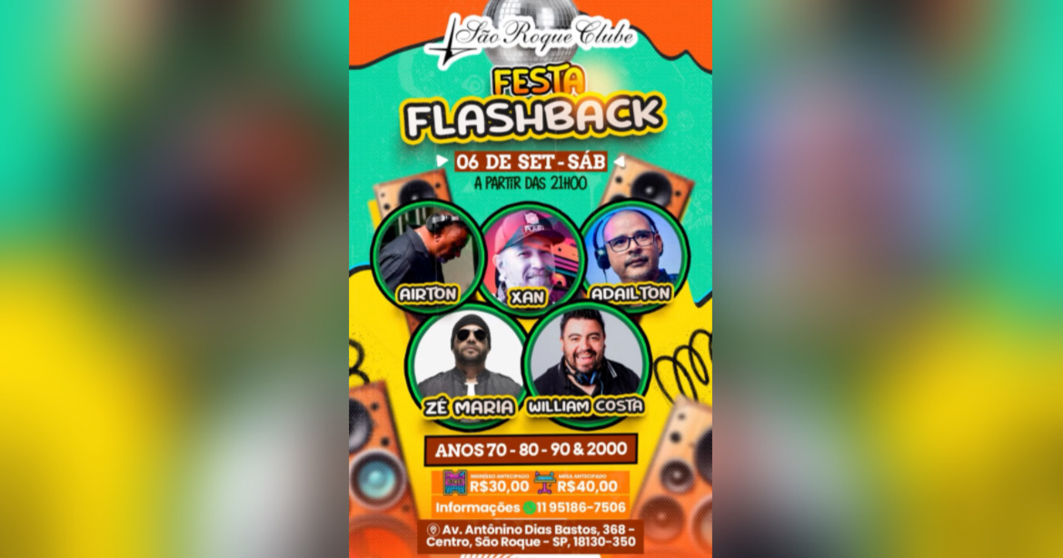 A Festa Flashback acontece no São Roque Clube, no sábado, 6 de setembro. A festa acontece às 21h e os ingressos já estão à venda.