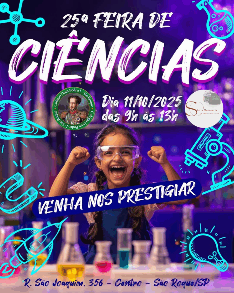 Neste sábado, 11 de outubro de 2025, das 9h às 13h, acontece a tradicional Feira de Ciências do Colégio Dom Pedro I, em parceria com a Santa Mercearia!