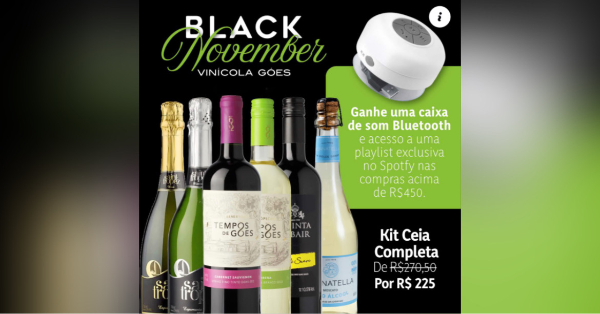 A Vinícola Góes, em São Roque, iniciou a campanha de Black November com a oferta de um brinde para clientes que realizarem compras a partir de R$ 450. Segundo a empresa, quem atingir o valor mínimo recebe uma caixa de som Bluetooth e acesso a uma playlist exclusiva no Spotify.