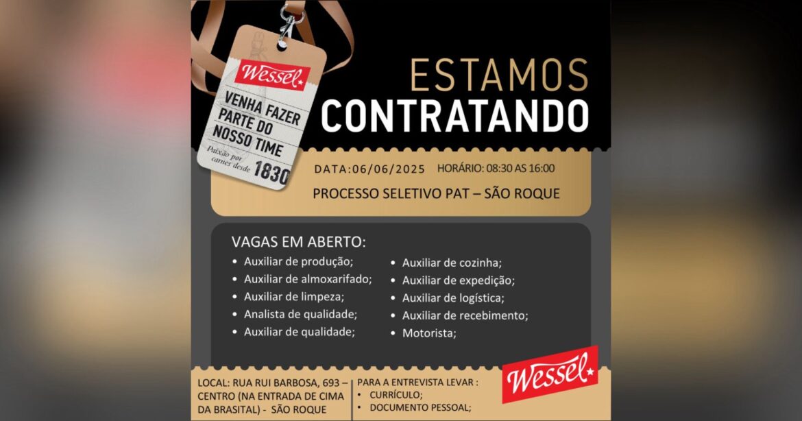 A Wessel está com vagas abertas e busca profissionais de São Roque (SP) e região para integrar sua equipe. A seleção será realizada no próximo dia 06 de junho de 2025 (sexta-feira), no PAT de São Roque.
